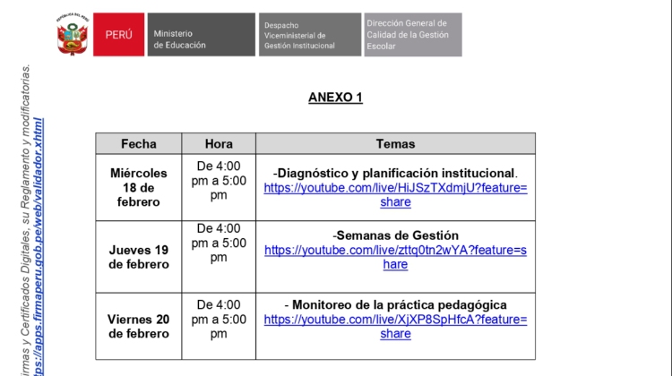 La Dirección General de Calidad de la Gestión Escolar (DIGC) del Ministerio de Educación (Minedu), en el marco del BIAE y en concordancia con las prioridades establecidas para el año 2026, ha previsto brindar orientaciones generales para la planificación e implementación de acciones y asistencias técnicas orientadas al fortalecimiento de las II.EE., mediante tres (3) webinars, los cuales serán desarrollados del 18 al 20 de febrero del presente año, a través de la plataforma YouTube.